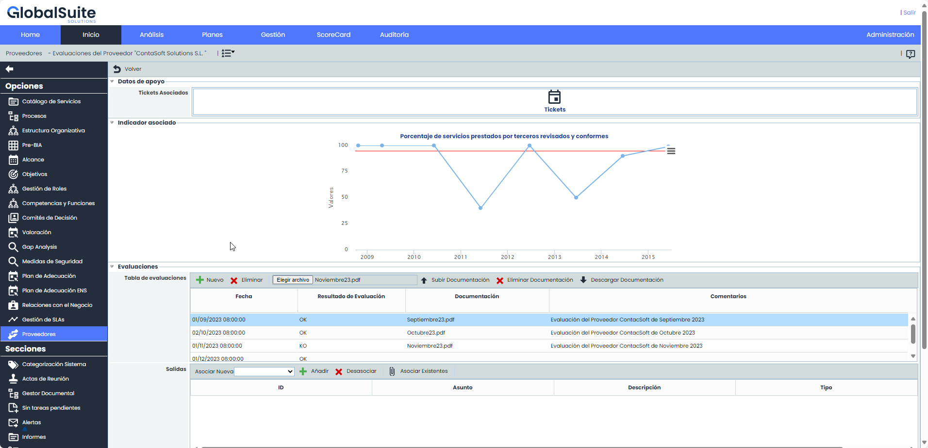 Output Table: If the evaluation results are not as expected by the user, the 'Outputs' field allows opening different tickets (incident, corrective action, etc.) to manage the supplier's compliance.