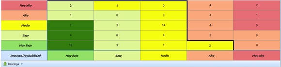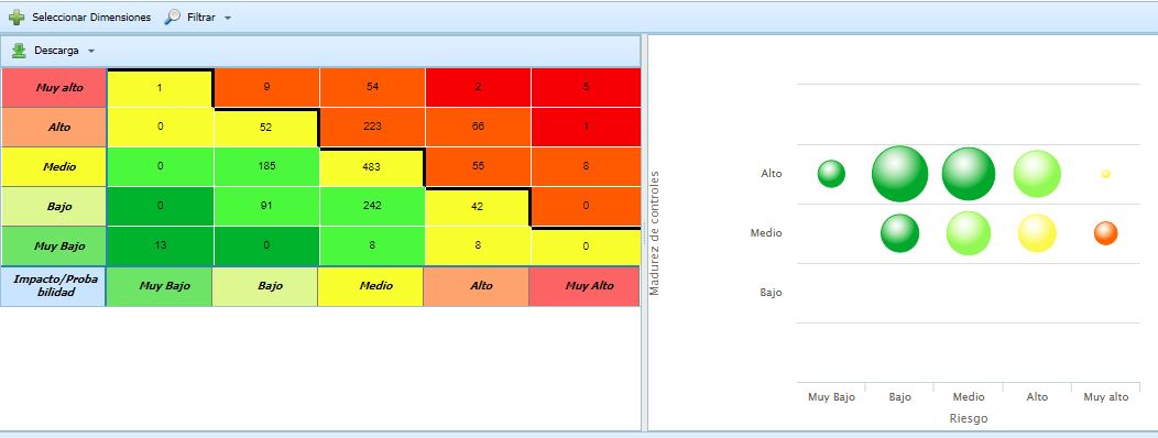 In the upper section, a matrix of the dimensions defined to calculate the risk is displayed, based on the analysis methodology defined in the 'Settings/Analysis Methodologies' section.