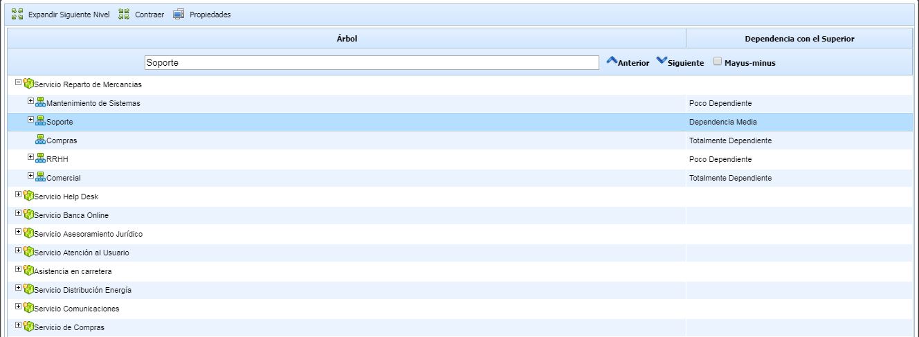 Mostrar Dependencias: Muestra en una ventana emergente, el árbol de dependencias de la organización filtrando por el proceso del BIA Consolidado. En esta ventana se podrá visualizar las dependencias de procesos y que activos (software, hardware, comunicaciones, etc.) necesita cada proceso. Además, pulsando el botón Propiedades, se abrirá una nueva pestaña con la información del elemento que se necesite analizar.