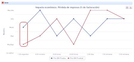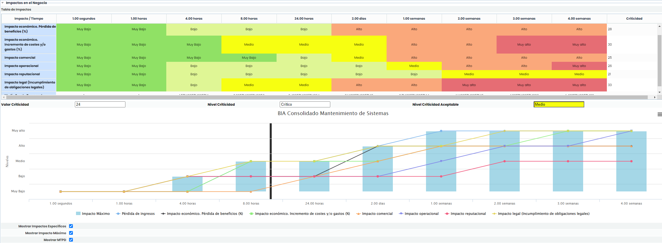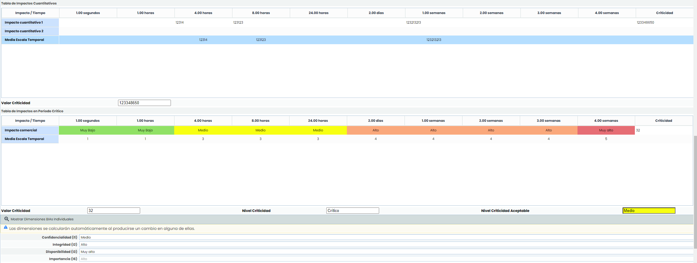 Mostrar Valores: Muestra los valores por los cuales se calcula el nivel de impacto. Estos valores han sido definidos en el apartado de Ajustes> Continuidad de Negocio > Configuración BIA.