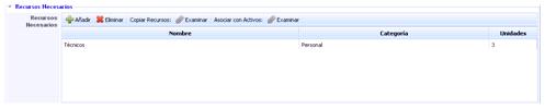 Copiar Recursos: Permite asociar los recursos necesarios identificados en los BIA’s individuales. Al pulsar sobre el botón ‘Examinar’ se muestra un listado con todos los recursos identificados. Para asociarlos se ha de seleccionar el checkbox deseado y pulsar el botón ‘Asociar Registros’.