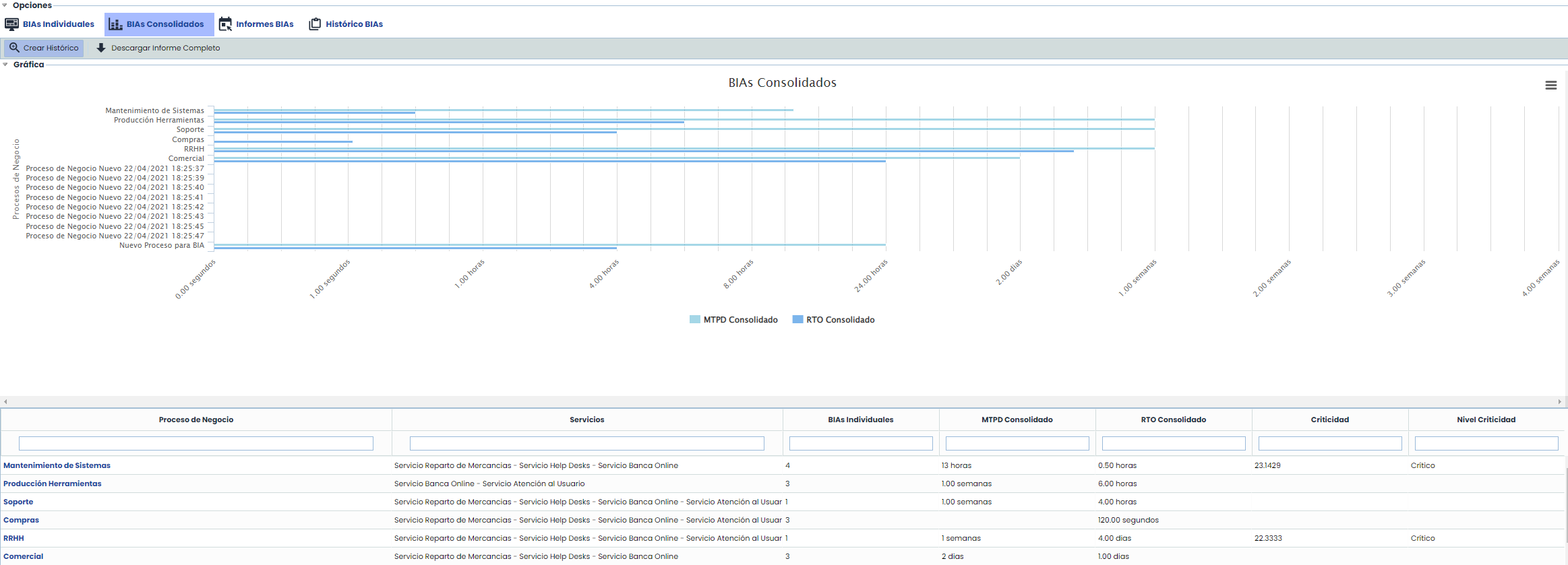 Al acceder a la opción, la herramienta muestra una gráfica que representa el MTPD y RTO consolidado de los procesos, así como el listado con los procesos definidos en el alcance. Cada proceso tiene identificado los servicios a los que presta apoyo, el número de BIAs individuales realizados sobre ese proceso, el MTPD consolidado y el RTO consolidado.