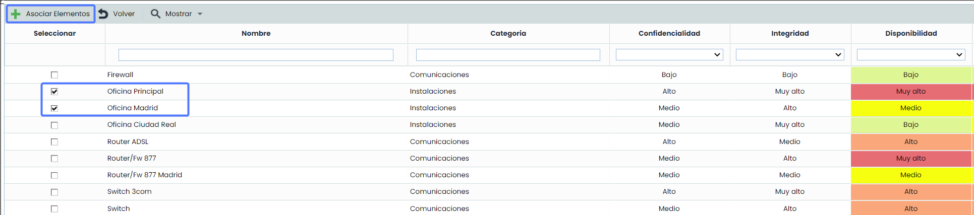 Si el proceso se encuentra en el árbol de dependencias con elementos asociados, en la tabla de elementos aparecen por defecto los elementos que se encuentren asociados en dicho árbol de dependencias. Si, por el contrario, el proceso no se encuentra en el árbol de dependencias, en la tabla de activos se muestran todos los elementos del inventario.