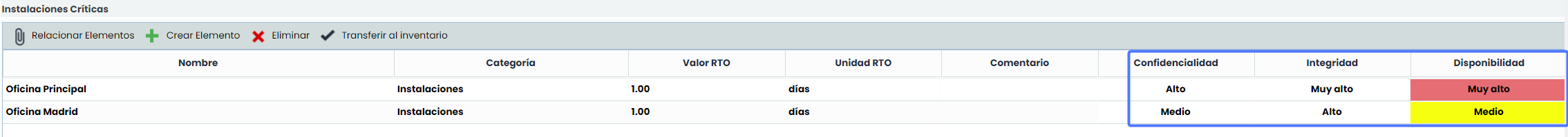Para todos los elementos incorporados en la pregunta tipo "Tabla de Elementos" se permite especificar el instante de recuperación en caso de desastre, utilizando los campos "Valor RTO" y "Unidad RTO", y la "Categoría", además de poder añadir un comentario para cada elemento. Además se podrán valorar las dimensiones añadidas de los elementos del inventario.