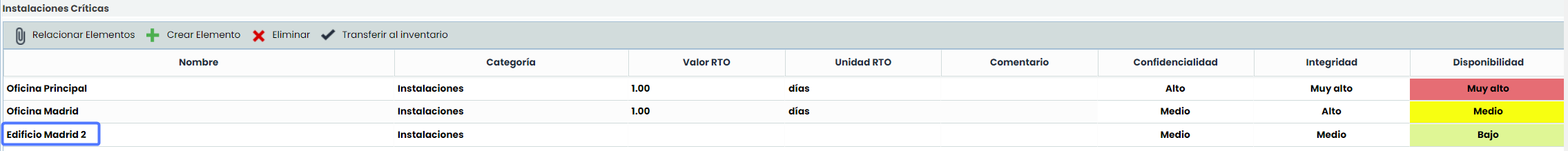 Una vez añadido al inventario, el elemento aparecerá en negro. Además, los elementos incluidos en las preguntas de tipo Tabla Elementos, se consolidarán en el Inventario > Tabla de Elementos junto con la valoración indicada en el BIA Consolidado, y se incluirán bajo el Proceso de Negocio en el Árbol de Elementos.