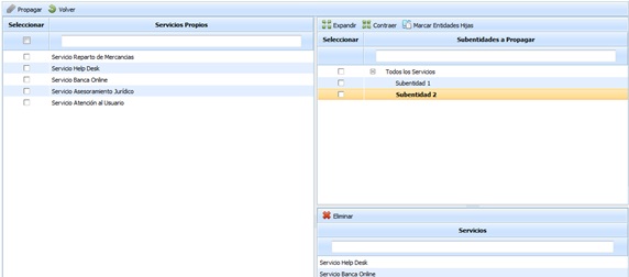 Propagar: Una vez seleccionados los servicios deseados permite propagar los mismo a las subentidades seleccionadas.