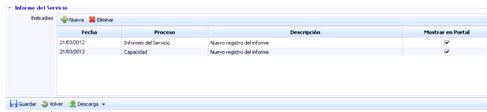 La opción de Informe de Servicio permite mostrar en el portal de clientes información periódica sobre el desarrollo del servicio. Se pueden elegir los informes que se muestran a los clientes dentro del campo ‘Mostrar en el Portal’. Para crear una nueva entrada se debe pulsar el botón ‘Nuevo’. Para eliminar un informe se deberá seleccionar la fila o filas a eliminar en la tabla y pulsar el botón ‘Eliminar’.