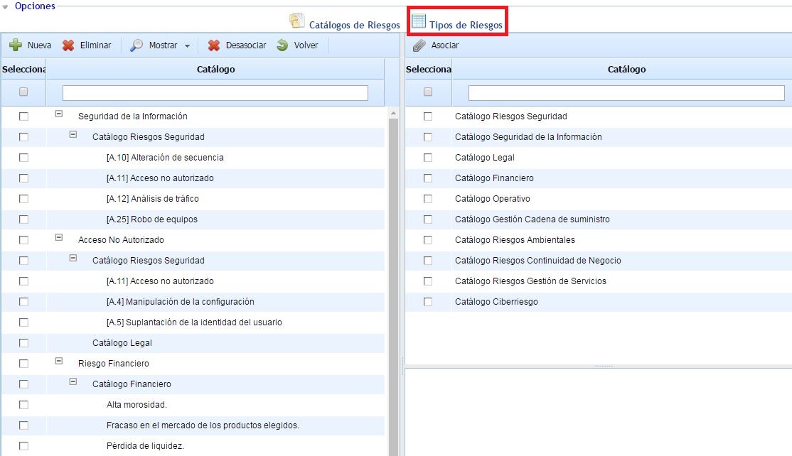 Desasociar: Permite desasociar un catálogo y/o riesgo de una categoría de riesgo. Para ello se debe seleccionar el catálogo o riesgo que se quiere desvincular y pulsar sobre el botón 'Desasociar'.