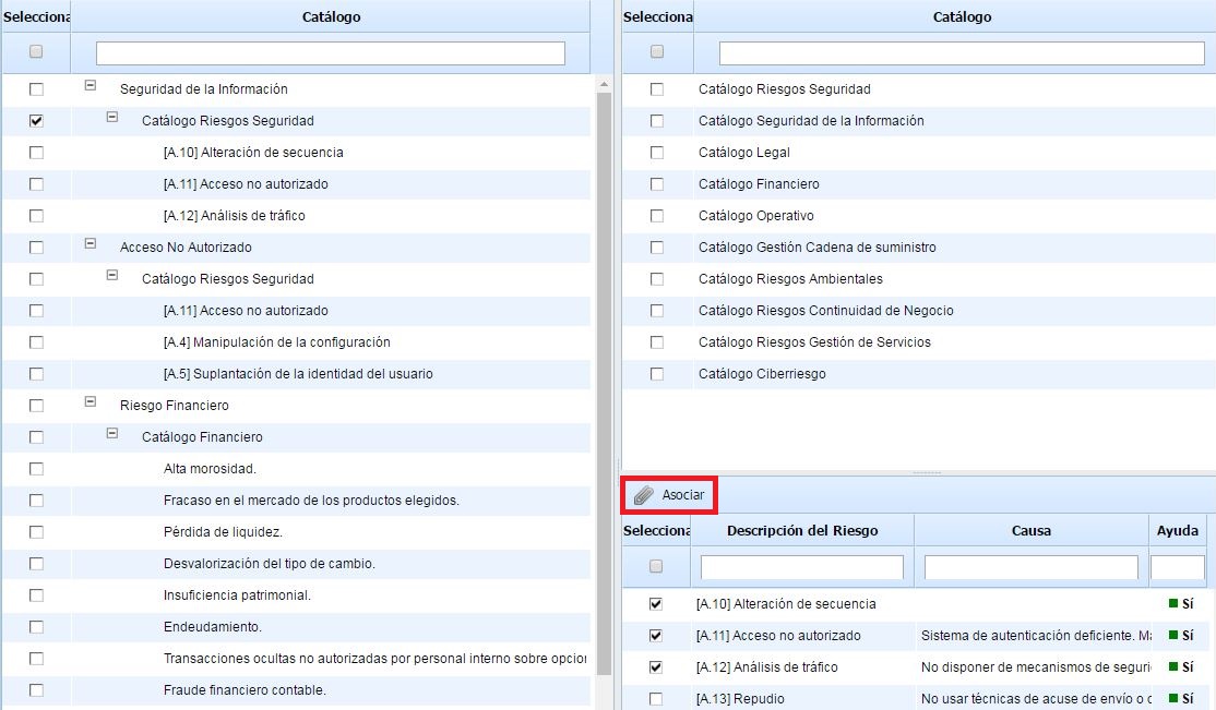 Una vez realizada la asociación entre las categorías y los catálogos, se permite seleccionar los riesgos de cada catálogo que están relacionados con la categoría correspondiente. Para ello, se debe seleccionar un catálogo en la tabla de la izquierda, apareciendo en la parte inferior derecha todos los riesgos del catálogo. En este punto, se puede seleccionar los riesgos deseados y al pulsar sobre el botón "Asociar" situado encima de la tabla de riesgos, se asocian los riesgos a cada categoría.