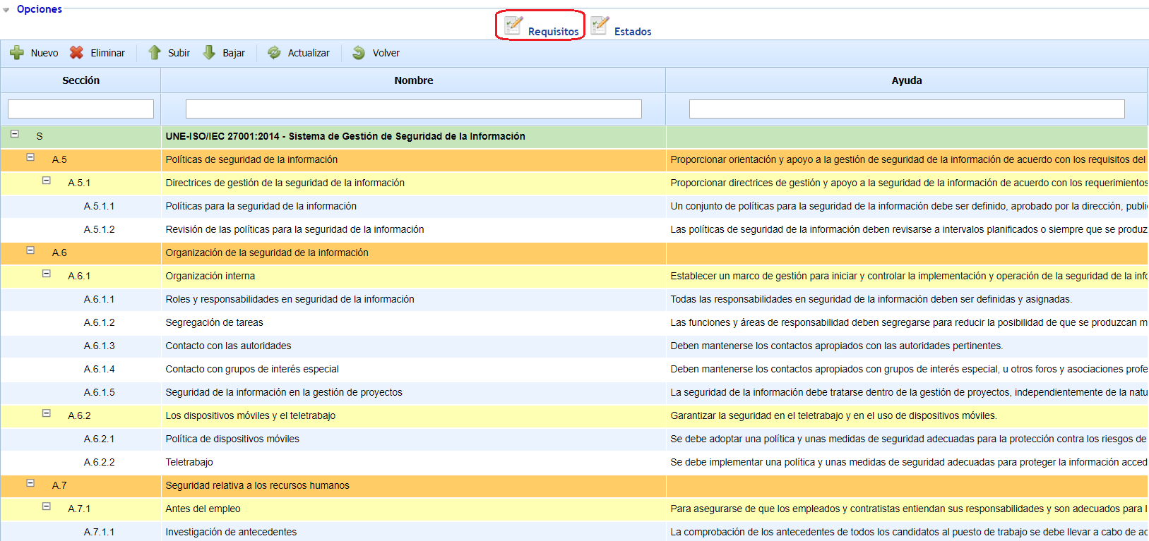 Al acceder al catálogo se muestra la estructura de requisitos en forma de árbol. La tabla permite las siguientes opciones: