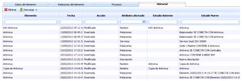 El apartado Historial muestra un listado ordenado con las modificaciones que ha sufrido el elemento desde el momento que se ha activado, pudiendo realizar las siguientes acciones: