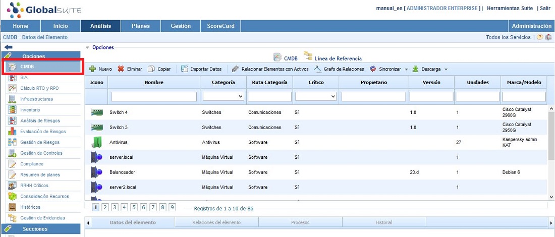 - Es crítico: Ofrece la posibilidad de definir si el elemento es critico para un servicio, lo que permite alertar que debe realziarse una análisis de riesgos del mismo en el apartado de 'Análisis/Análisis de Riesgos'