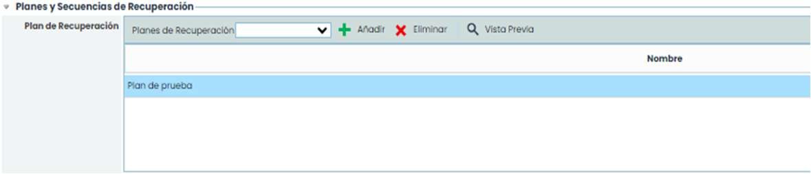 Una vez definida la primera parte del formulario, se pasa a seleccionar el plan de recuperación sobre el que se va a realizar las pruebas. Se puede seleccionar más de un plan a la vez. Para seleccionarlos hay que pinchar en el desplegable de “Planes de Recuperación”, seleccionar el/los planes que se quieran, y pulsar “Añadir”.