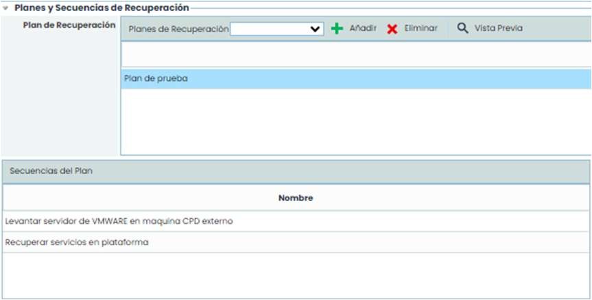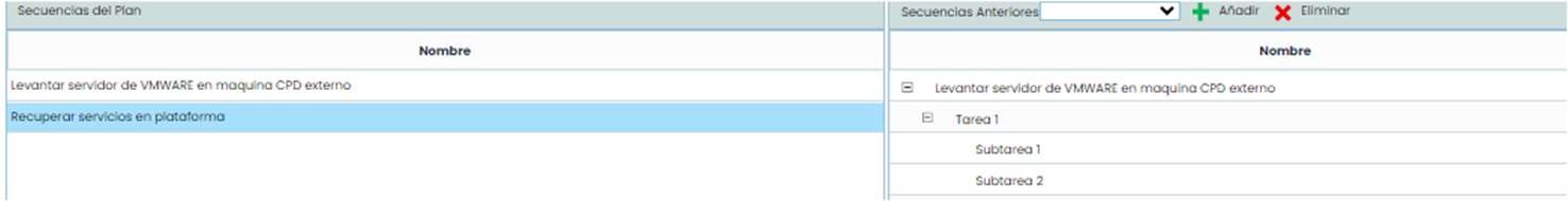 Al seleccionar el/los planes de recuperación aparecerán las secuencias de este con sus diferentes tareas, tal y como se ha configurado anteriormente en la opción de “Planes de Recuperación”. Para ver estas secuencias hay que pulsar sobre el Plan sobre el que se quieren ver las secuencias.