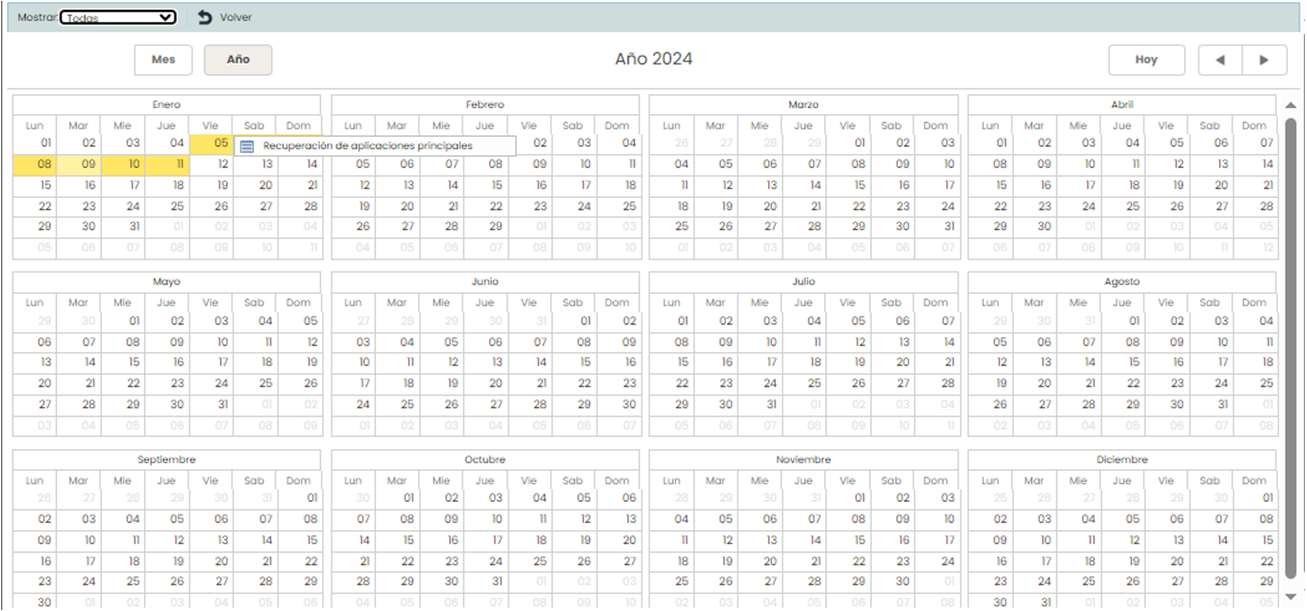 Además de ello, si se pulsa sobre el botón “Ver Calendario” se abrirá un calendario, en el cual se marca en amarillo el día actual y los días en los que las diferentes pruebas han sido planificadas y realizadas.
