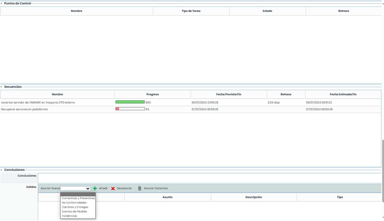 Si alguna tarea tuviera puntos de control aparecía en dicha opción. También aparecen las secuencias con su progreso y fechas. Y, al final de todo, las conclusiones, o la relación de cada tarea con una serie de incidencias, cambios, acciones correctivas, si se hubiera producido alguna.