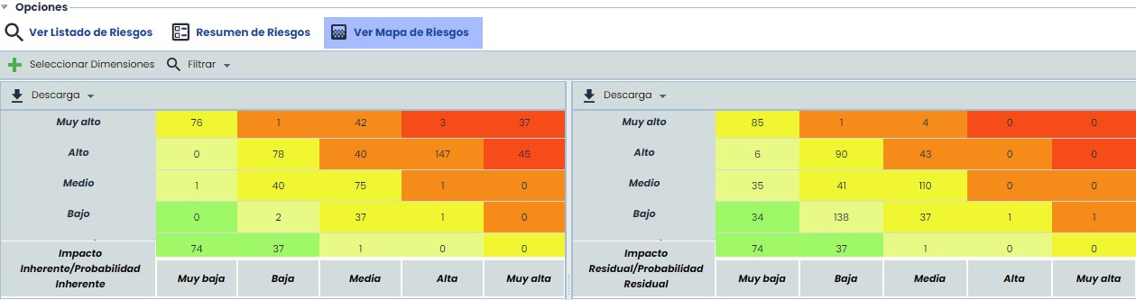 Esta opción muestra el mapa riesgos (o mapa de calor) con los riesgos identificados en la opción “Análisis de Riesgos”.