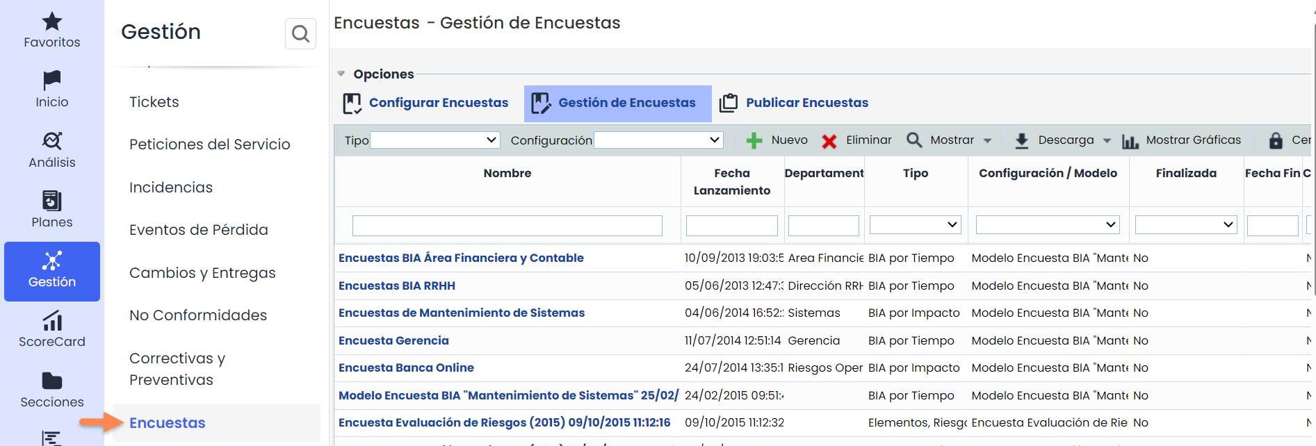 Esta opción permite gestionar todas las encuestas creadas en la publicación de encuestas. Al realizar la publicación, todas las encuestas enviadas a los destinatarios se generan en esta opción.