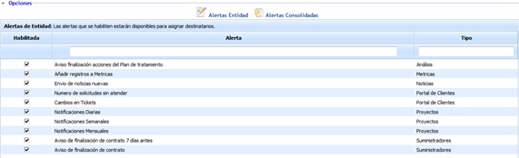 Para asociar las alertas al cliente se ha de seleccionar las mismas en la tabla. Las alertas que ofrece GlobalSUITE son las siguientes: