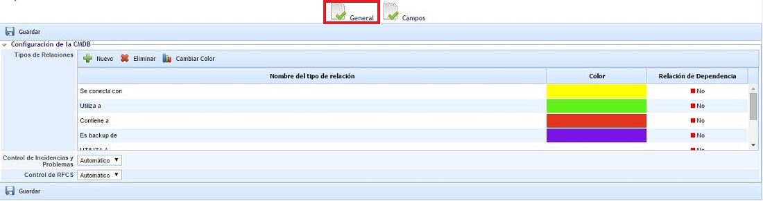 General: Permite la personalización de los "Tipos de Relaciones" y del control automático o manual para los "Incidentes y Problemas" y las "RFC".