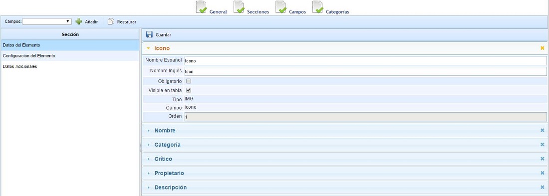 La primera vez que se pulsa sobre el botón "Restaurar" la solución carga automáticamente en la tabla izquierda las 3 secciones que componen la información de un CI en la configuración original: "Datos del Elemento", "Configuración del Elemento" y "Datos Adicionales". Además, tras pulsar el botón "Restaurar" también se puede observar que las pestañas de la opción "CMDB" se han ampliado, añadiendo a la pestaña de "General" y "Campos", las pestañas de "Secciones" y "Categorías".