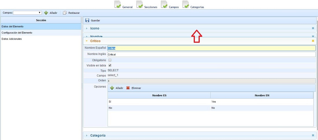 Opciones: Consiste en una tabla para indicar las diferentes opciones que se permitirá seleccionar al usuario en ese campo del formulario del CI. Solo disponible en los campos de tipo SELECT.
