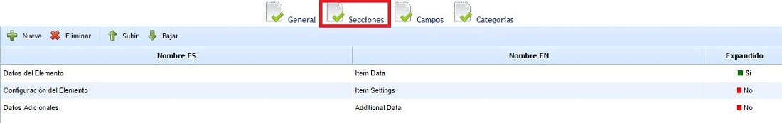 Eliminar: Permite eliminar una sección de las existentes. Deberá primero seleccionar la sección y a continuación pulsar el botón "Eliminar".