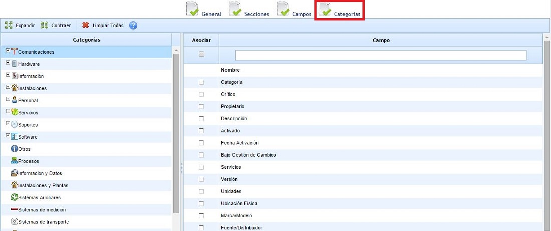 La pestaña de "Categorías" permite configurar los campos que contendrá cada una de las categorías y/o clases de los Elementos de Configuración de la CMDB.