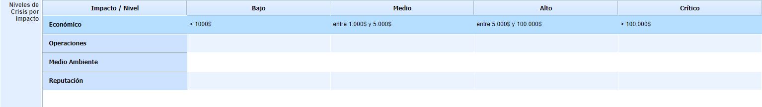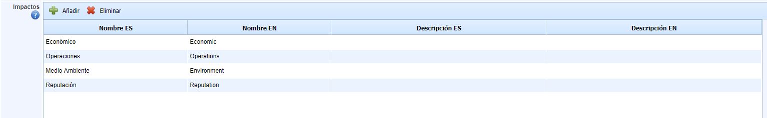 Este apartado permite definir los diferentes impactos que pueden afectar a una crisis. Estos niveles se utilizan en los Planes de Gestión de Crisis y en las Gestiones de Crisis. Es posible asignar el nombre y la descripción tanto en español como en inglés.