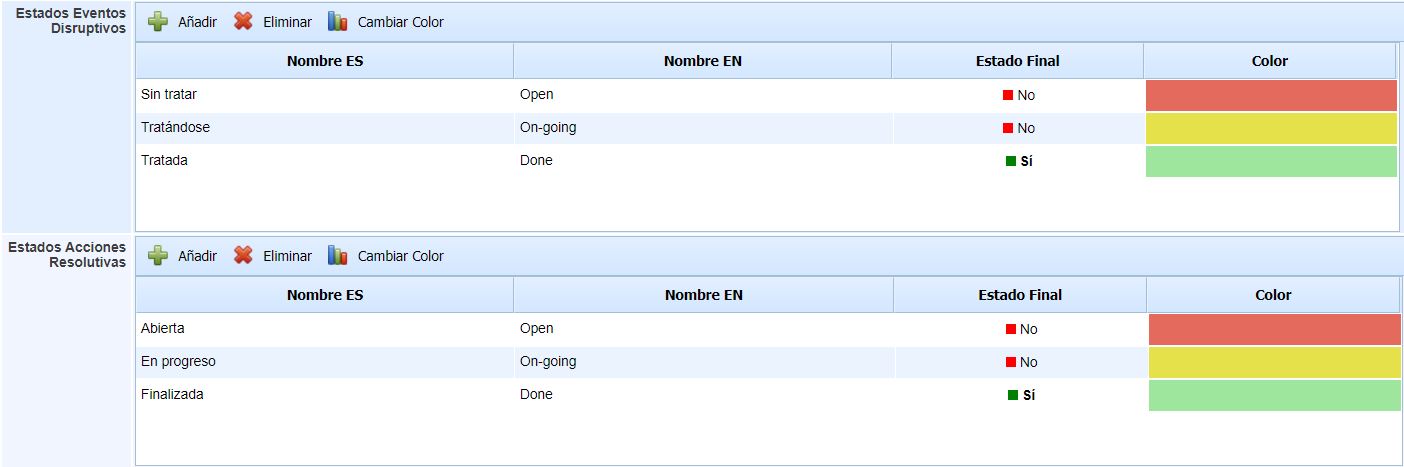 Este apartado permite definir estados de los Eventos Disruptivos y las Acciones Resolutivas que se utilizarán en la opción de Gestión de la Crisis. Es posible asignar el nombre tanto en español como en inglés.