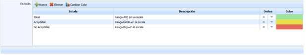 Escalas: Permite identificar el rango de valores que se mostrarán en la gráfica del apartado ‘ScoreCard/Objetivos de Negocio’.