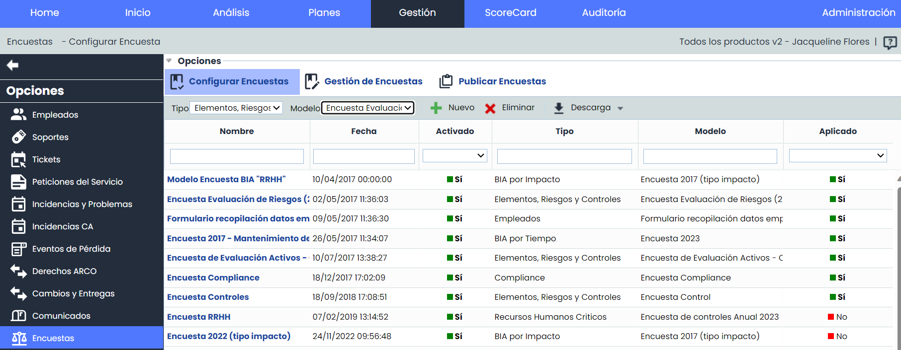 Aplicado: Ofrece la posibilidad de visualizar si la encuesta ha sido generada en el apartado de 'Gestión encuestas'
