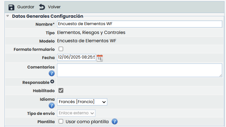 Modelo: Permite seleccionar qué modelo utilizar para la configuración de la encuesta. Los modelos que aparecen corresponden a aquellos que se han definido en el apartado de Ajustes > Modelos de Encuestas.