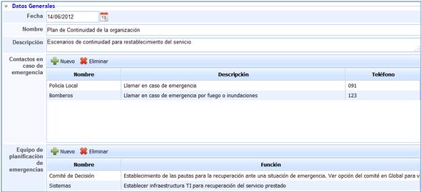 Nombre: Permite definir el nombre concreto del Plan de Continuidad.