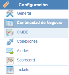 En esta opción se encuentran diferentes tablas y campos para configurar las funcionalidades específicas de Continuidad de Negocio (BIA, Planes, Pruebas y y Gestión de Crisis). A continuación se explican las diferentes secciones que se encuentran en esta opción.