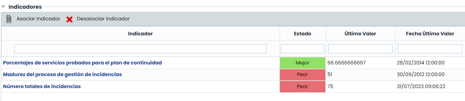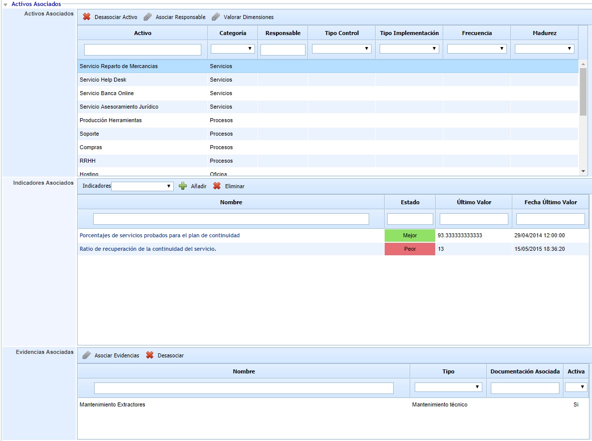 Por último, cuando seleccionamos un activo, las tablas siguientes de “Indicadores Asociados” y “Evidencias Asociadas” se cargan con los indicadores y evidencias del control para cada elemento, que son independientes de los indicadores y evidencias generales del control.