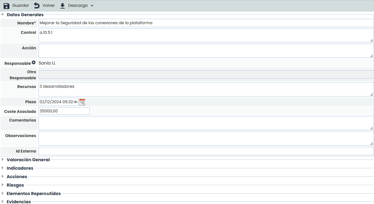 Plazo: Identifica el plazo en el cual la acción debe estar completada. Este plazo no debe ser superior al plazo de implantación definitivo del control.