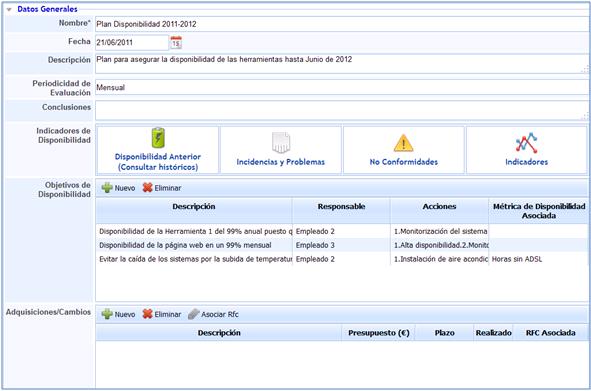 Objetivos de Disponibilidad: Permite establecer los diferentes objetivos que se quieren conseguir con respecto a la disponibilidad.
