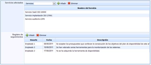 Al igual que ocurre con el campo Adquisiciones/Cambios, los servicios afectados son diferentes en función de los objetivos de disponibilidad definidos. Seleccionando cada uno de los objetivos se podrán mostrar dichos servicios.