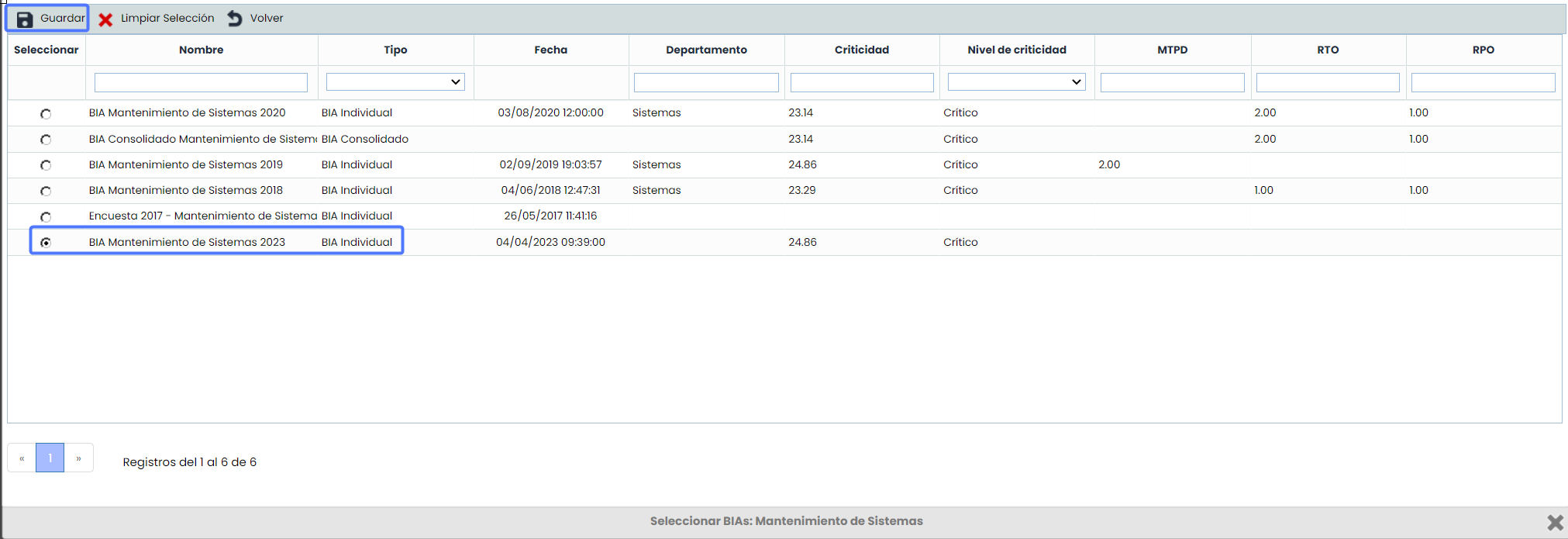 BIA: Permite la posibilidad de crear una encuesta por Tiempo o por Impacto a partir de los datos de un BIA ya creado, tanto individual como consolidado del Proceso de Negocio seleccionado. Esta opción permite al destinatario actualizar sólo los cambios producidos desde la última actualización. De este modo se parte de la información vigente y se simplifica la consolidación.