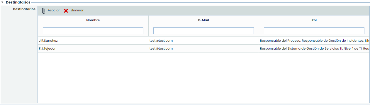 Si el Modelo de Encuesta no tiene configurados estados (en cuyo caso hay que definir el responsable para cada estado), se podrán definir qué personas, seleccionadas de Empleados, recibirán la encuesta que se cree a partir de esta configuración. En caso de incluir más de un destinatario, se creará una encuesta independiente para cada uno de ellos.