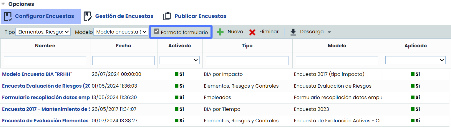 Esta opción aparece en encuestas de Elementos , encuestas de Riesgos-Controles y Encuestas de Elementos Riesgos controles.