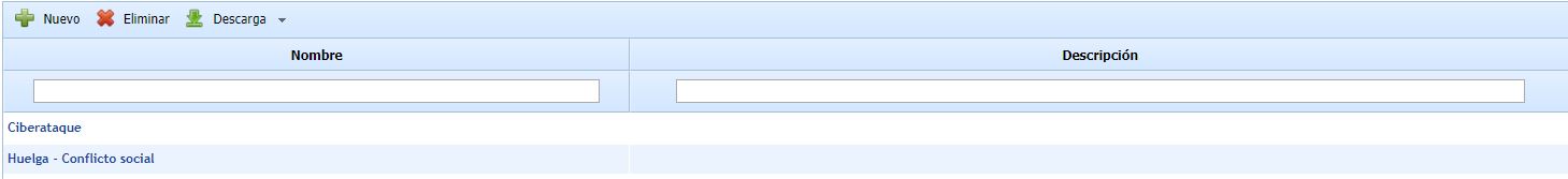 Tabla izquierda: Muestra el listado de escenarios de crisis que se han definido en la empresa matriz. Las opciones que permite la tabla son: