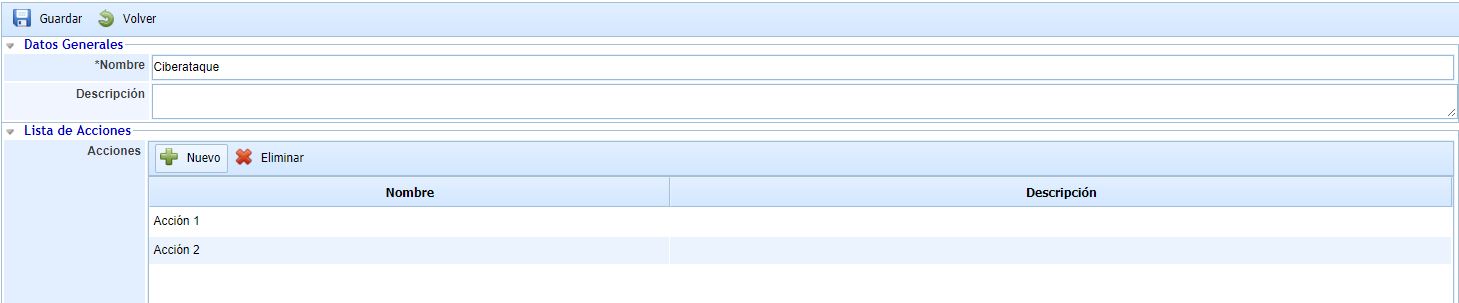 En el presente apartado permiten definirse todos aquellas acciones que sería necesario llevar a cabo en caso de que tuviera lugar el escenario de crisis. Puede rellenarse tanto el nombre como la descripción de dicha acción.