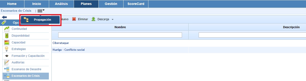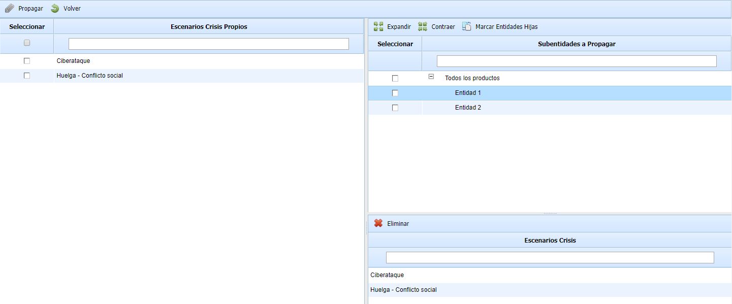 Propagar: Una vez seleccionados los escenarios de crisis deseados permite propagar los mismos a las subentidades seleccionadas.