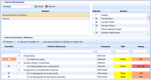 El presente apartado muestra los activos y amenazas asociadas al escenario que tienen un nivel de riesgo por encima del nivel de riesgo aceptable. Este listado incluye también la lista de amenazas de los procesos seleccionados, así como la de los activos seleccionados y asociados a los procesos. De la misma forma es posible identificar tanto la categoría a la que pertenecen, el nivel de riesgo aceptable aprobado por la organización, como el nivel de riesgo de las amenazas asociadas a cada uno de los activos. el Análisis de Riesgos.