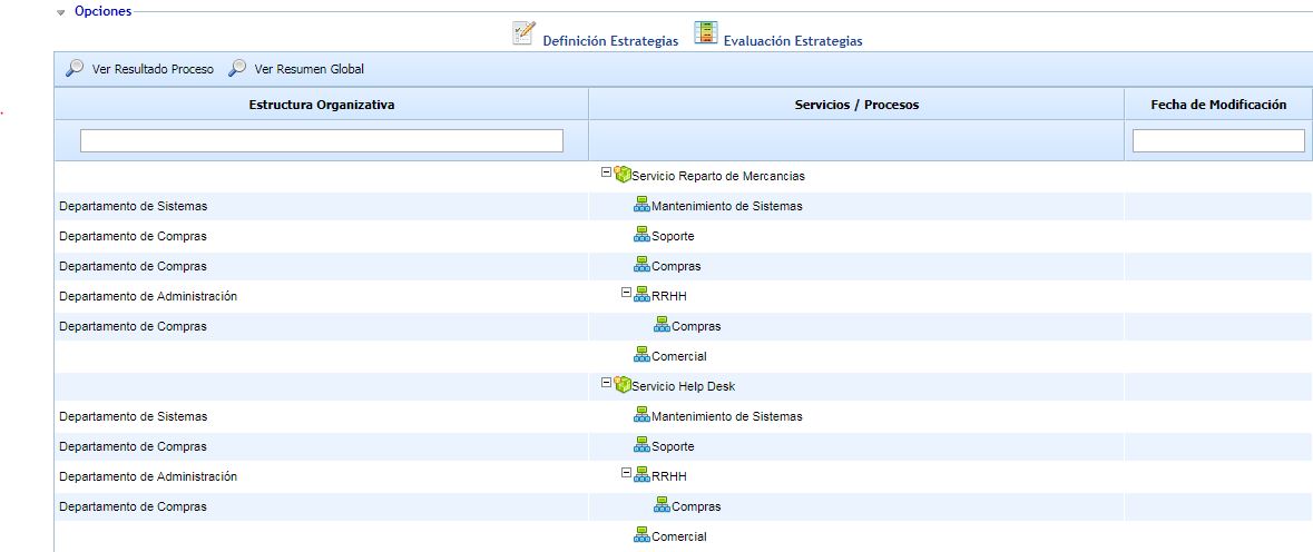 Ver Resultado Global: Dependiendo de la estructura organizativa seleccionada, se mostrará un resumen de los procesos de negocio que pertenecen a la estructura organizativa selecciona y las estrategias del conjunto de procesos de negocio.