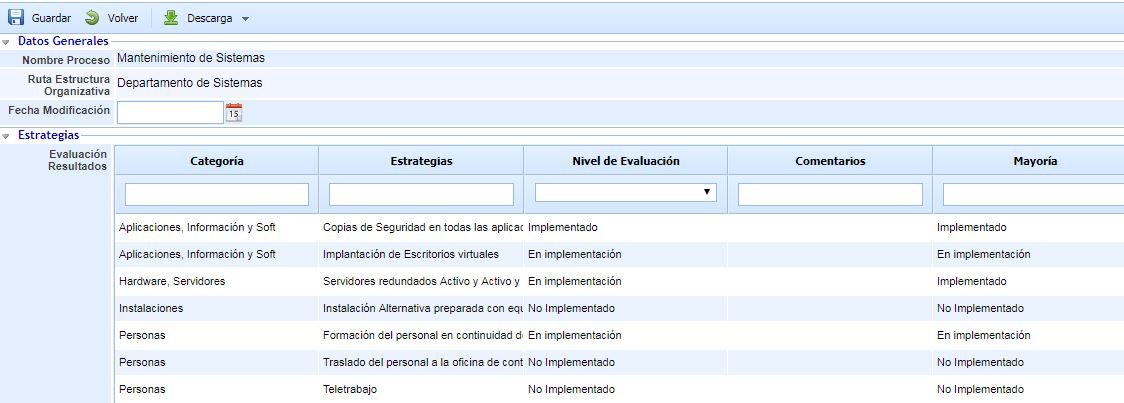 Evaluación de Resultados: Listado de las estrategias que afectan al proceso seleccionado. Se pueden ver las siguientes columnas: