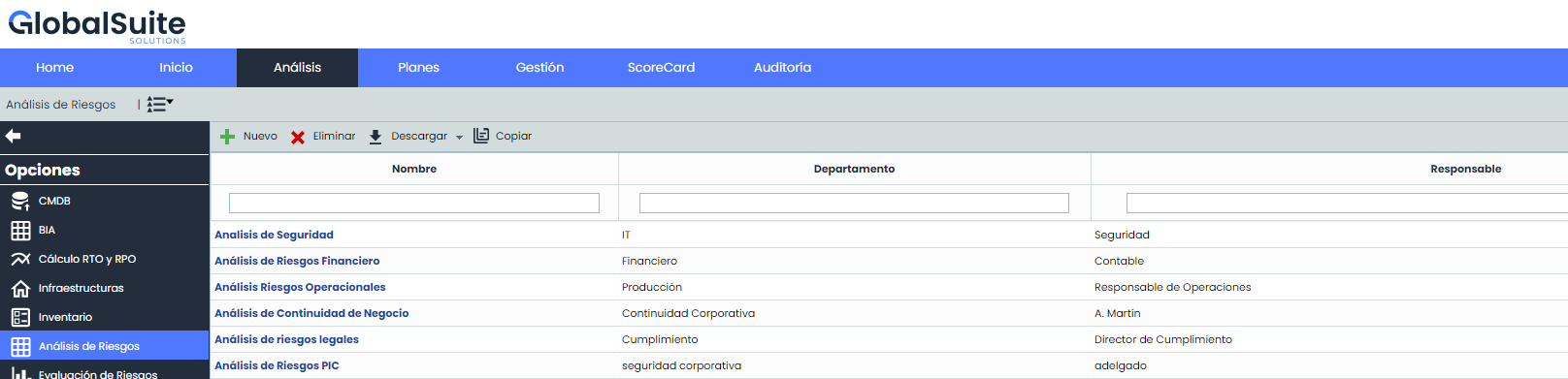 La opción de gestión de riesgos permite establecer un plan de tratamiento de riesgos sobre aquellos elementos que han sido valorados en el apartado de Análisis de Riesgos.