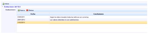 La tabla de evaluaciones muestra de manera resumida las conclusiones a las que ha llegado el gestor sobre el cumplimiento del SLA. Para realizar una evaluación se ha de pulsar el botón ‘Nueva’ y se genera una nueva línea donde poder establecer la fecha de evaluación y las conclusiones. En caso de querer eliminar una evaluación, se ha de seleccionar la línea o líneas deseadas y pulsar el botón ‘Eliminar’.